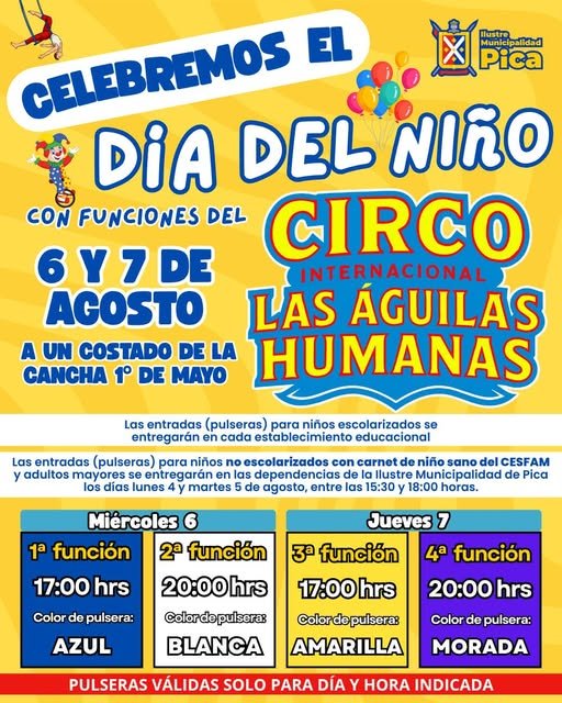 Pulseras para niños no escolarizados y adultos mayores se entregarán en la Municipalidad de Pica los días lunes 4 y martes 5 de agosto, de 15:30 a 18:00 hrs, presentando el Carnet de Niño Sano (CESFAM).