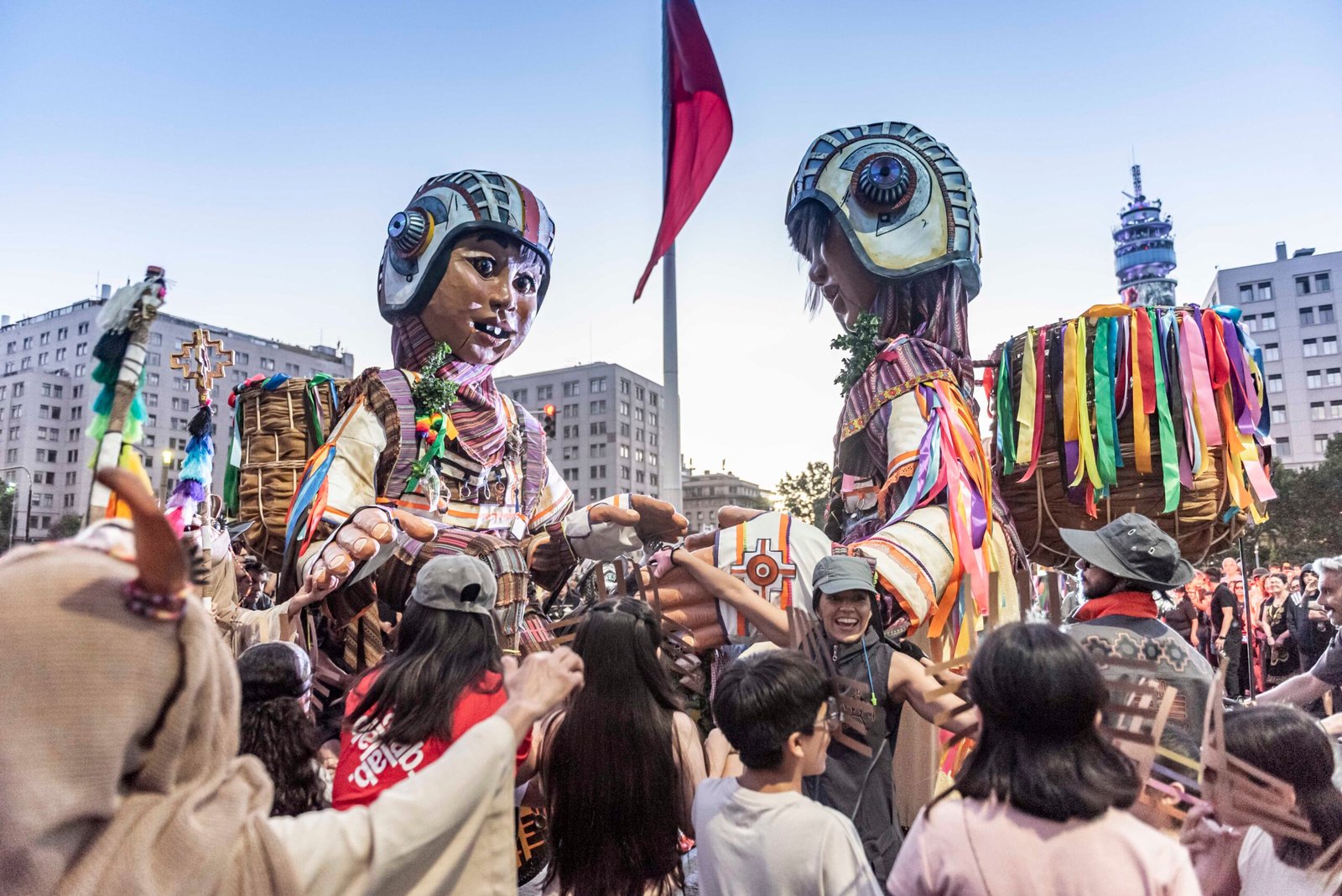 El Gigante y los niños Wara Wara es un pasacalle de gran formato que transforma la ciudad en escenario vivo. Inspirada en el geoglifo del gigante de Tarapacá y su universo visual, la pieza narra la historia de los niños Wara Wara, pequeños viajeros del tiempo y el espacio que llegan desde las estrellas para despertar a un gigante dormido.