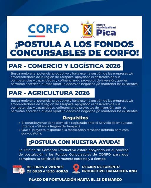 La Ilustre Municipalidad de Pica, a través de su Oficina de Fomento Productivo, invita a emprendedores y empresas de la comuna a postular a los Fondos Concursables de CORFO 2026, una oportunidad para fortalecer sus negocios y desarrollar nuevos proyectos.