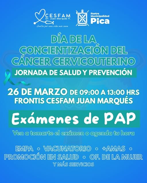 La Ilustre Municipalidad de Pica, junto al CESFAM Dr. Juan Marqués, invita a la comunidad a participar en una Jornada de Salud y Prevención, enfocada en el cuidado y bienestar de todas las mujeres de nuestra comuna.